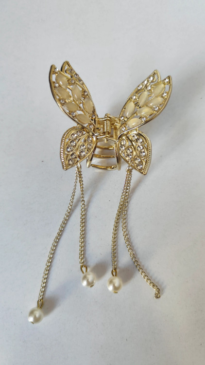 کلیپس مجلسی پروانه طلایی یک کلیپس آویزدار با سنگ های کریستالی است که از بهترین متریال ساخته شده و تماما وارداتی می باشد. این کلیپس با مروارید کاری شده و با ترکیب رنگ طلایی زیبایی فوق العادهای را دارد. جنس کلیپس از فلز و رنگ ثابت است.کلیپس مجلسی پروانه کریستال برای موهای نیمه باز، حجم متوسط و كم حجم مناسب است. اگر به دنبال اکسسوری لوکس و متفاوت برای تكمیل استایل مجلسی خود هستید