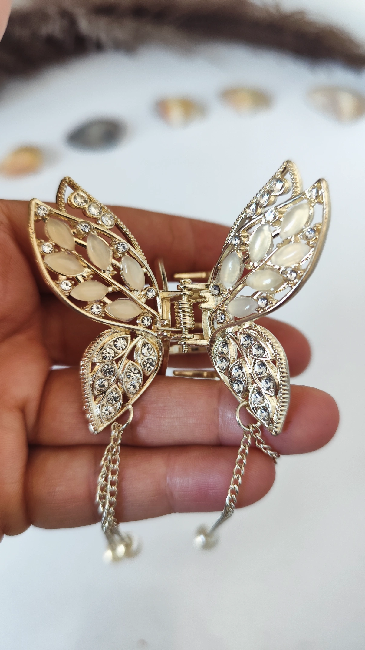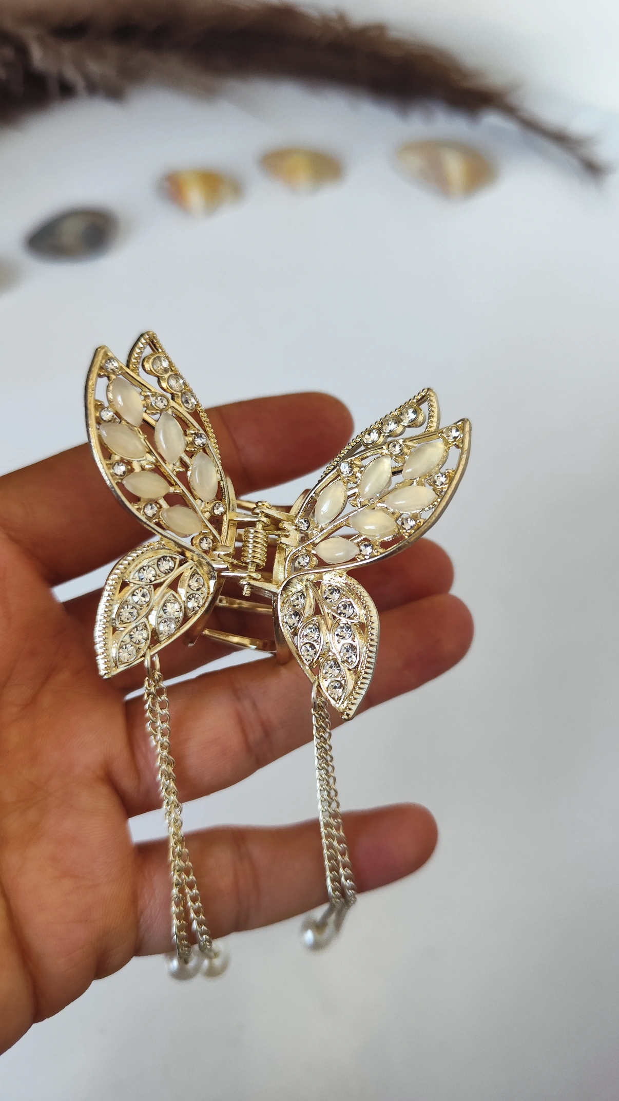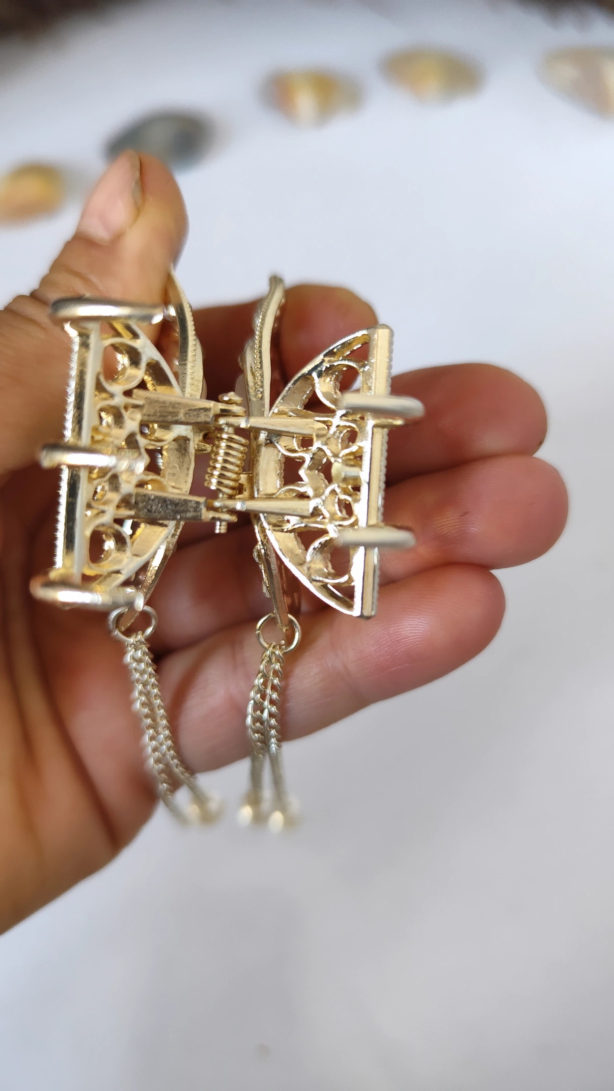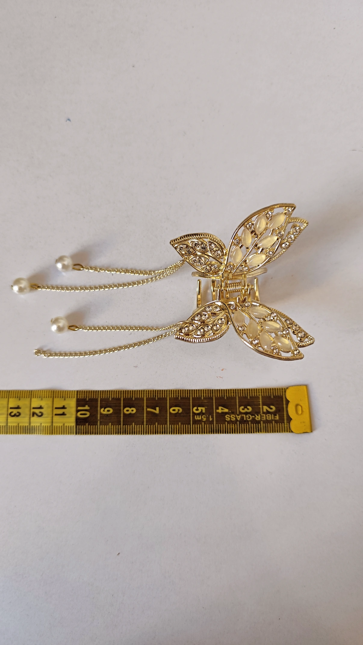 کلیپس مجلسی پروانه طلایی یک کلیپس آویزدار با سنگ های کریستالی است که از بهترین متریال ساخته شده و تماما وارداتی می باشد. این کلیپس با مروارید کاری شده و با ترکیب رنگ طلایی زیبایی فوق العادهای را دارد. جنس کلیپس از فلز و رنگ ثابت است.کلیپس مجلسی پروانه کریستال برای موهای نیمه باز، حجم متوسط و كم حجم مناسب است. اگر به دنبال اکسسوری لوکس و متفاوت برای تكمیل استایل مجلسی خود هستید